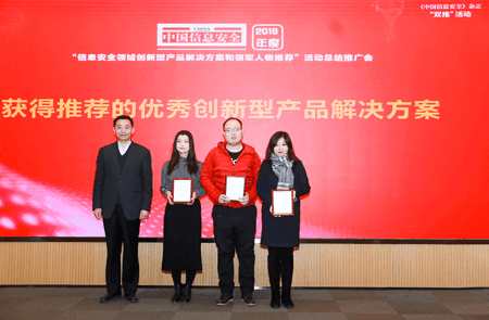 1月18日, 由中国互联网发展基金会指导、《中国信息安全》杂志社主办、《中国信息安全》理事会承办的2018年度“推荐创新型产品解决方案和领军人物”活动在北京举行。活动现场,中国工程院院士倪光南揭晓了获得推荐的15个创新型产品解决方案,其中 奥联基于国密SM9算法的加密电子邮件解决方案——密九邮荣获“优秀创新型产品解决方案”。
