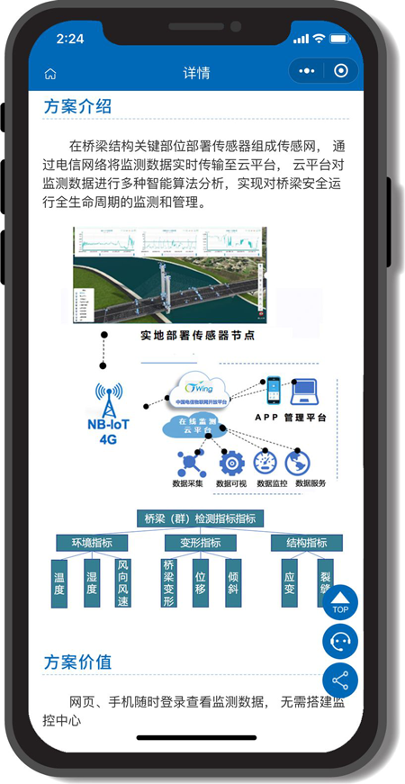 因货车超载所造成的大桥垮塌事件,近年来层出不穷。对此,有关部门也在不断加强道路安全管理和车辆管理,开展道路桥梁高清监控,积极探索城市智能化管理的创新实践。5G时代,万物智联。如何让桥梁插上“智慧”翅膀,保障人民财产安全,中国电信也在不断思考,并主动在多个城市进行创新实践。在智慧城市领域,中国电信天翼物联早已推出桥梁应力监测解决方案。方案依托物联网技术实现对桥梁以及桥梁群环境、变形、结构等参数变化检测,保障桥梁安全。