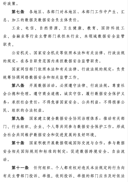 草案共分七章,依次为总则、数据安全与发展、数据安全制度、数据安全保护义务、政务数据安全与开放、法律责任和附则。
